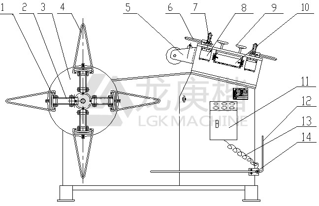 9.調整裝置 10.三軸滑座 11.電控箱 12.感應桿 13.感應線 14.感應軸
